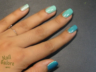 The colors I used are; (from little finger to thumb) Green from Skin Food nail vita, Essie’s Apple Mint Candy, Essie’s Caicos & Turquoise, Mixture of Essie’s C&T and Orly’s Bailamos, Orly Bailamos.